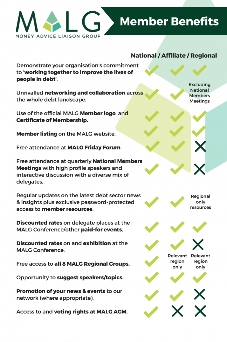 - Regular updates on the latest money advice industry news, views and guidance and exclusive password-protected access to member-only resources via MALG website